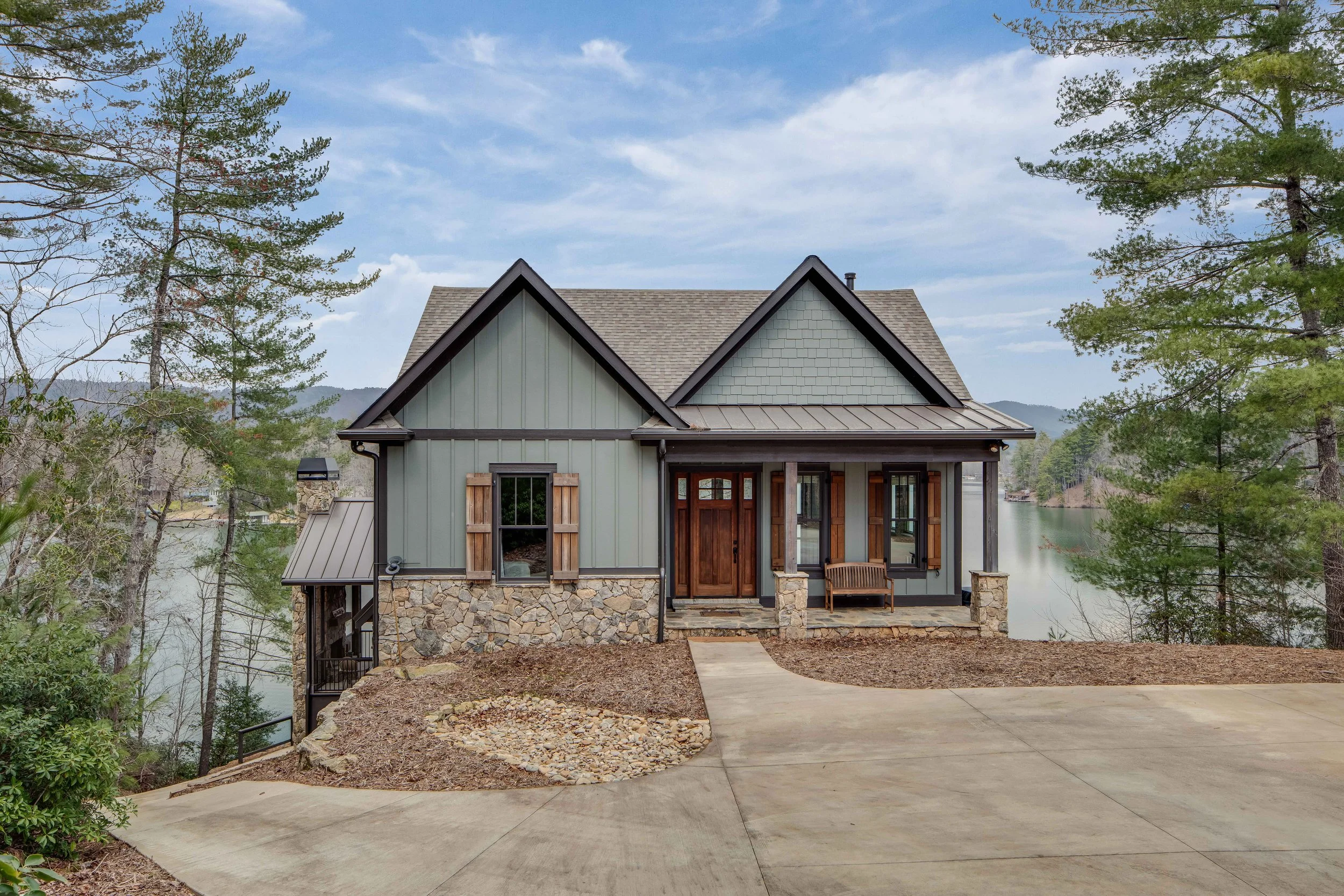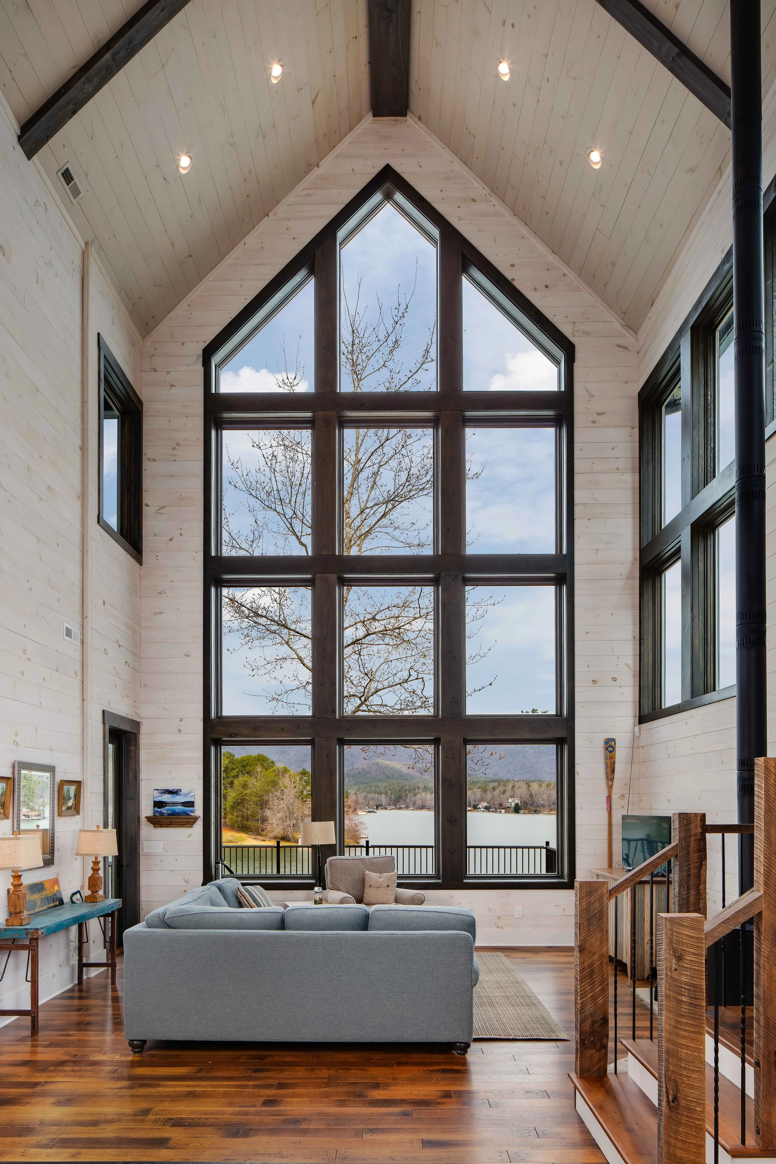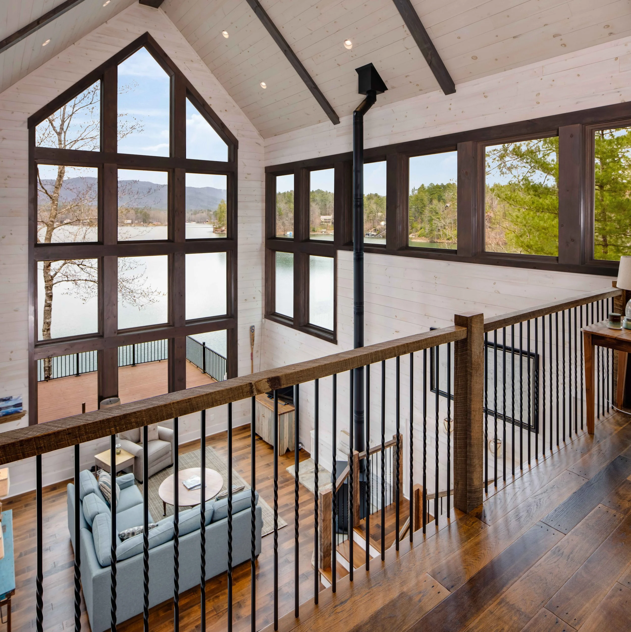 Designed for easy mountain getaways, this refined lake lodge pairs natural materials with expansive views of Lake Cherokee. Cedar, fieldstone, and pale wood create a warm, vaulted interior centered around a soaring window wall and open living spaces that flow to a spacious lakeside deck. With a serene main-level suite, screened porch with a stone fireplace, and elegant guest accommodations, this home offers year-round comfort and connection to nature.