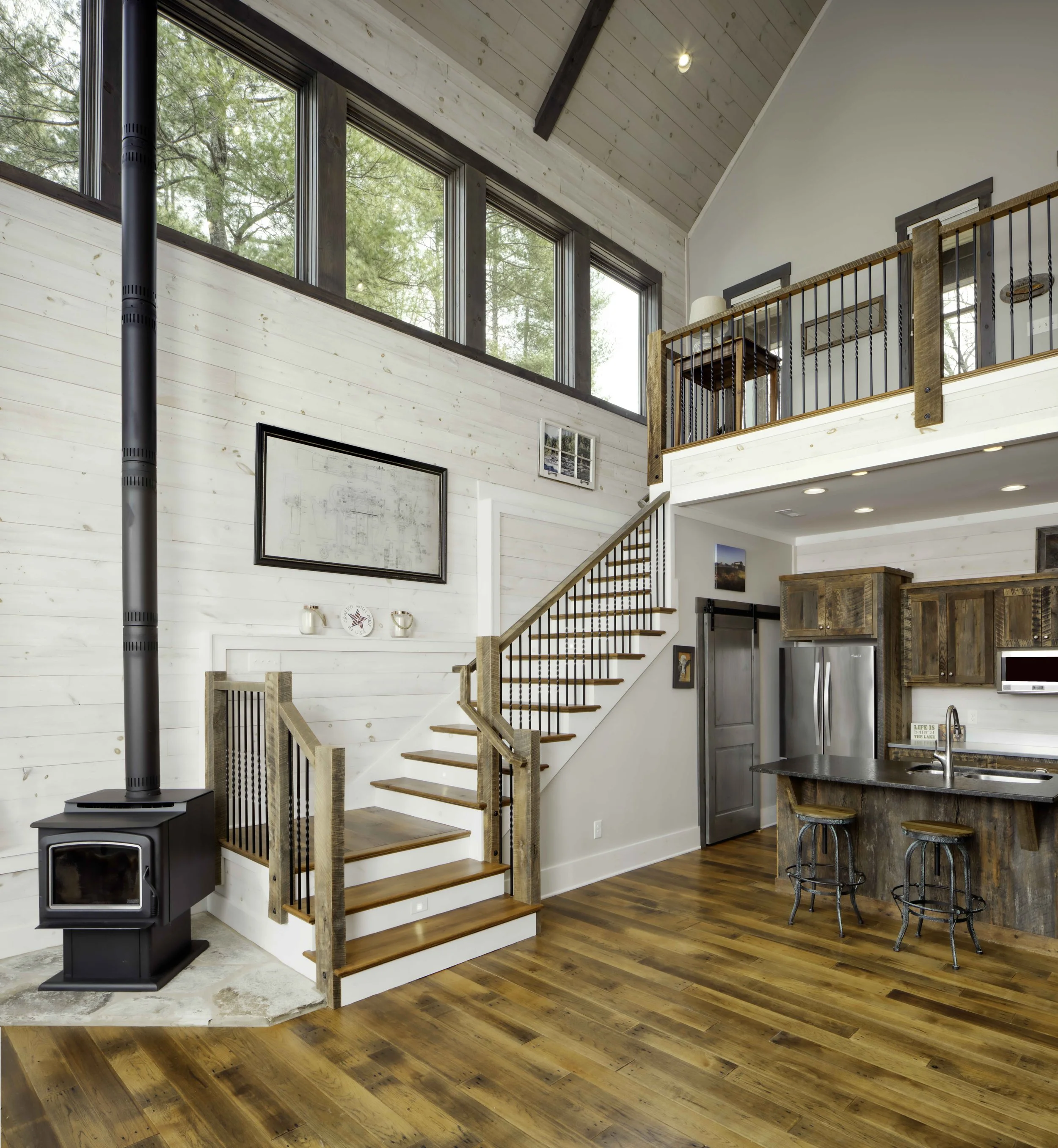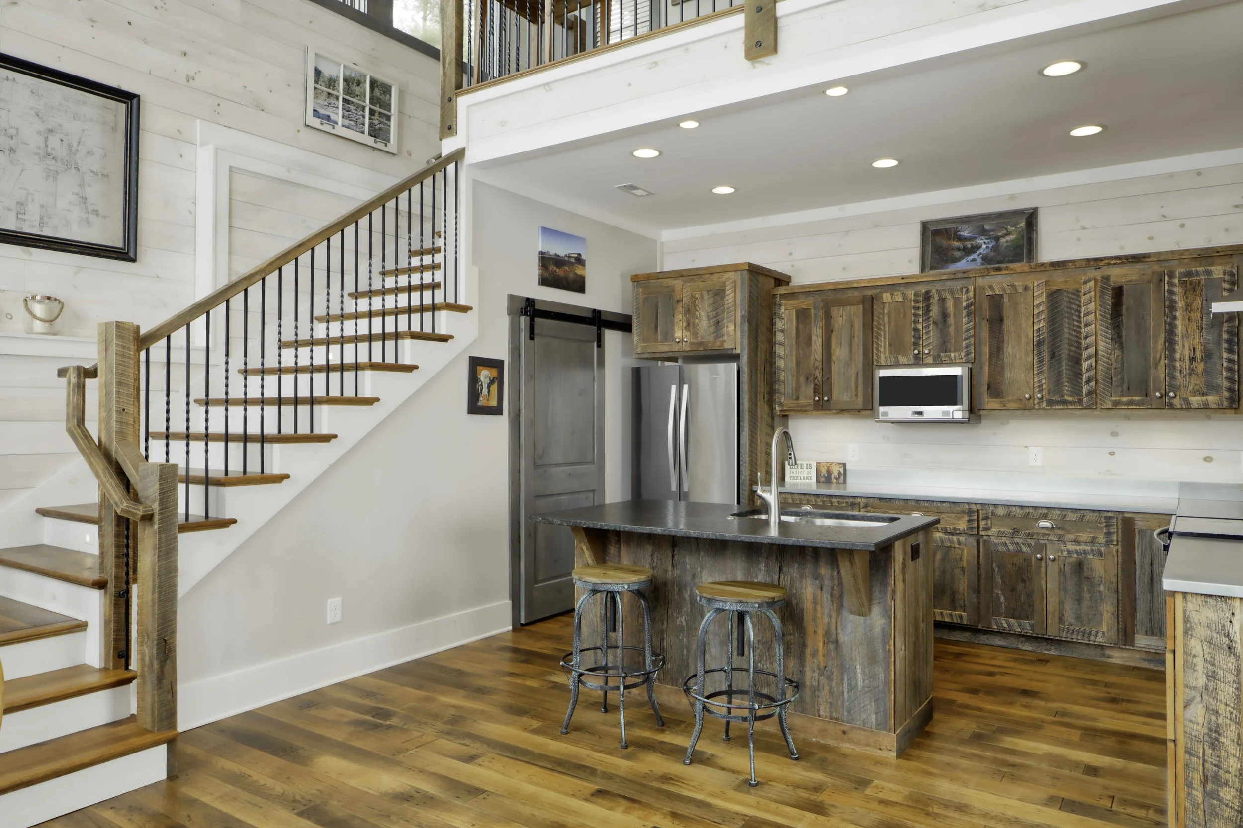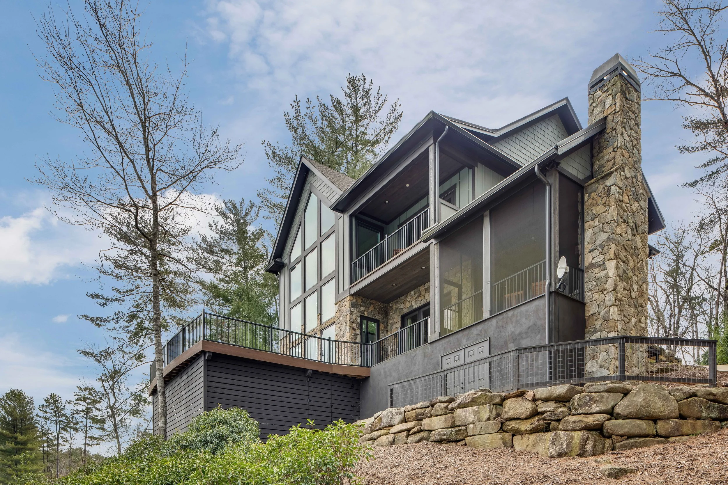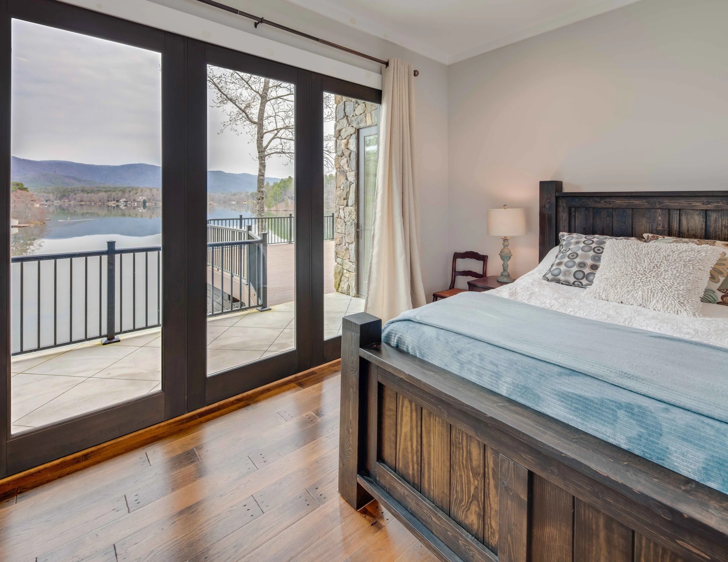 Designed for easy mountain getaways, this refined lake lodge pairs natural materials with expansive views of Lake Cherokee. Cedar, fieldstone, and pale wood create a warm, vaulted interior centered around a soaring window wall and open living spaces that flow to a spacious lakeside deck. With a serene main-level suite, screened porch with a stone fireplace, and elegant guest accommodations, this home offers year-round comfort and connection to nature.